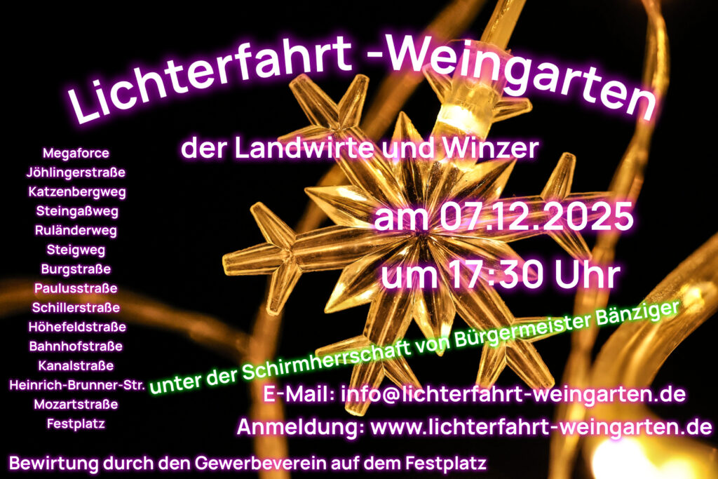 Es wird in naher Zukunft eine gemeinsame Präsens auf Facebook, Instagram und einer Webseite geben. Alle unter dem Namen: „Lichterfahrt-Weingarten“. Alle Neuerungen und alle Infos werdet ihr in Zukunft dort finden.